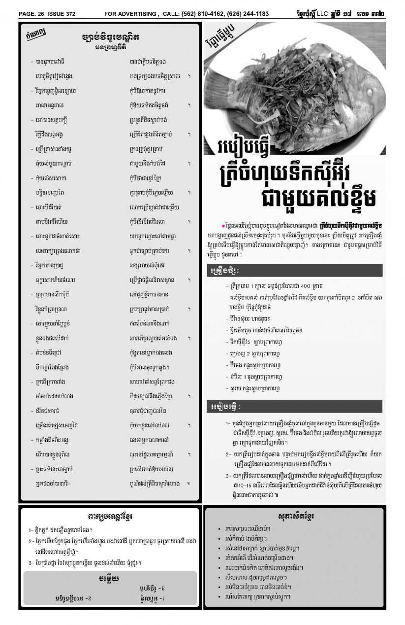 បើមានចំណាប់អារម្មណ៍ សូមធ្វើការទំនាក់ទំនងតាមរយៈ : P.O Box 4073, Long Beach CA 90804, 4Tel: (562) 810-4162 Jamie Meach / (626) 244-1183 Dara Long 4Email: info@thekhmerposts.com or jamiemeach09@gmail.com, 4 Web site: www.thekhmerposts.com