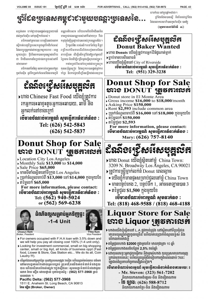បើមានចំណាប់អារម្មណ៍ សូមធ្វើការទំនាក់ទំនងតាមរយៈ : P.O Box 4073, Long Beach CA 90804, 4Tel: (562) 810-4162 Jamie Meach / (626) 244-1183 Dara Long 4Email: info@thekhmerposts.com or jamiemeach09@gmail.com, 4 Web site: www.thekhmerposts.com