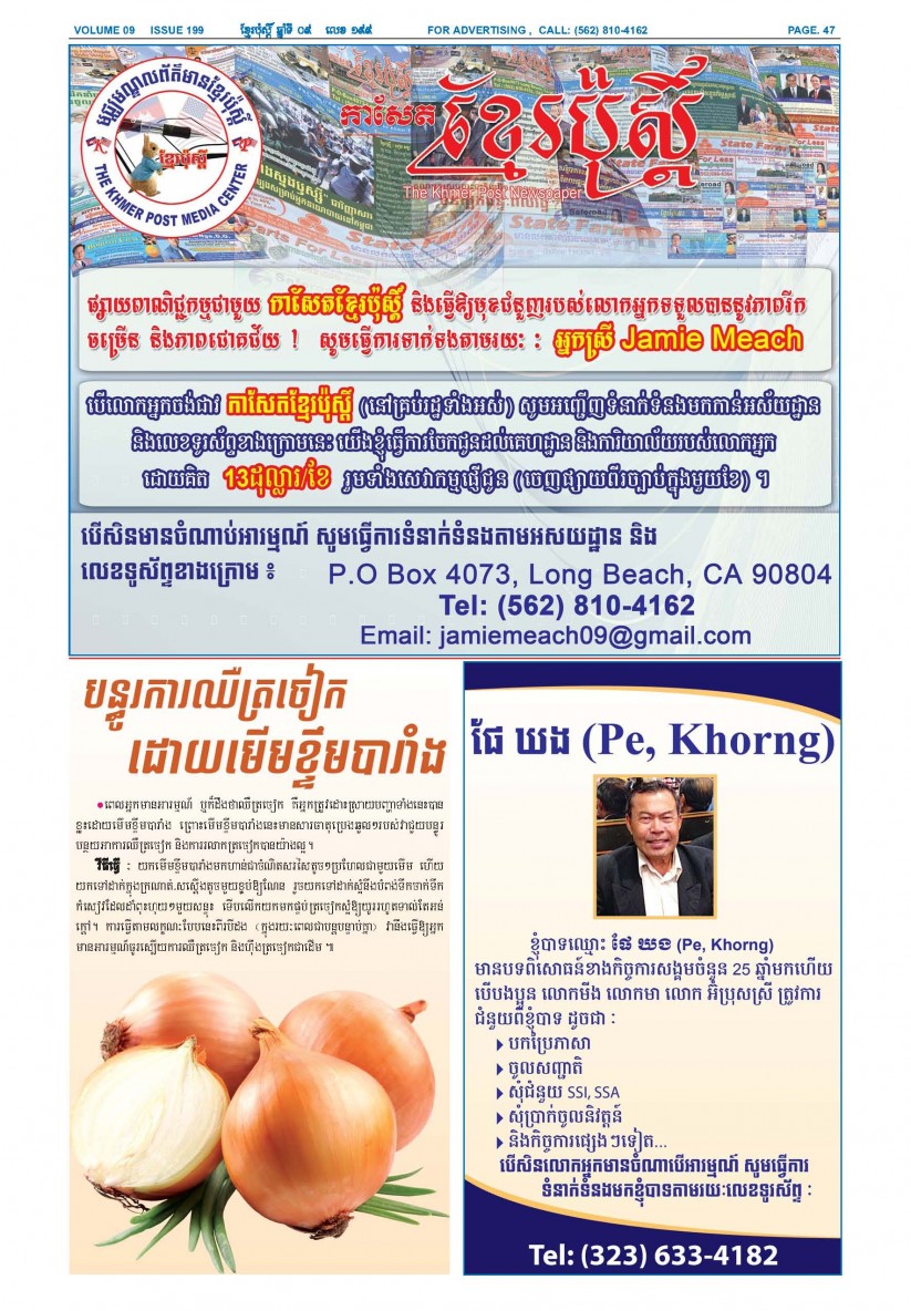 បើមានចំណាប់អារម្មណ៍ សូមធ្វើការទំនាក់ទំនងតាមរយៈ : P.O Box 4073, Long Beach CA 90804, 4Tel: (562) 810-4162 Jamie Meach / (626) 244-1183 Dara Long 4Email: info@thekhmerposts.com or jamiemeach09@gmail.com, 4 Web site: www.thekhmerposts.com