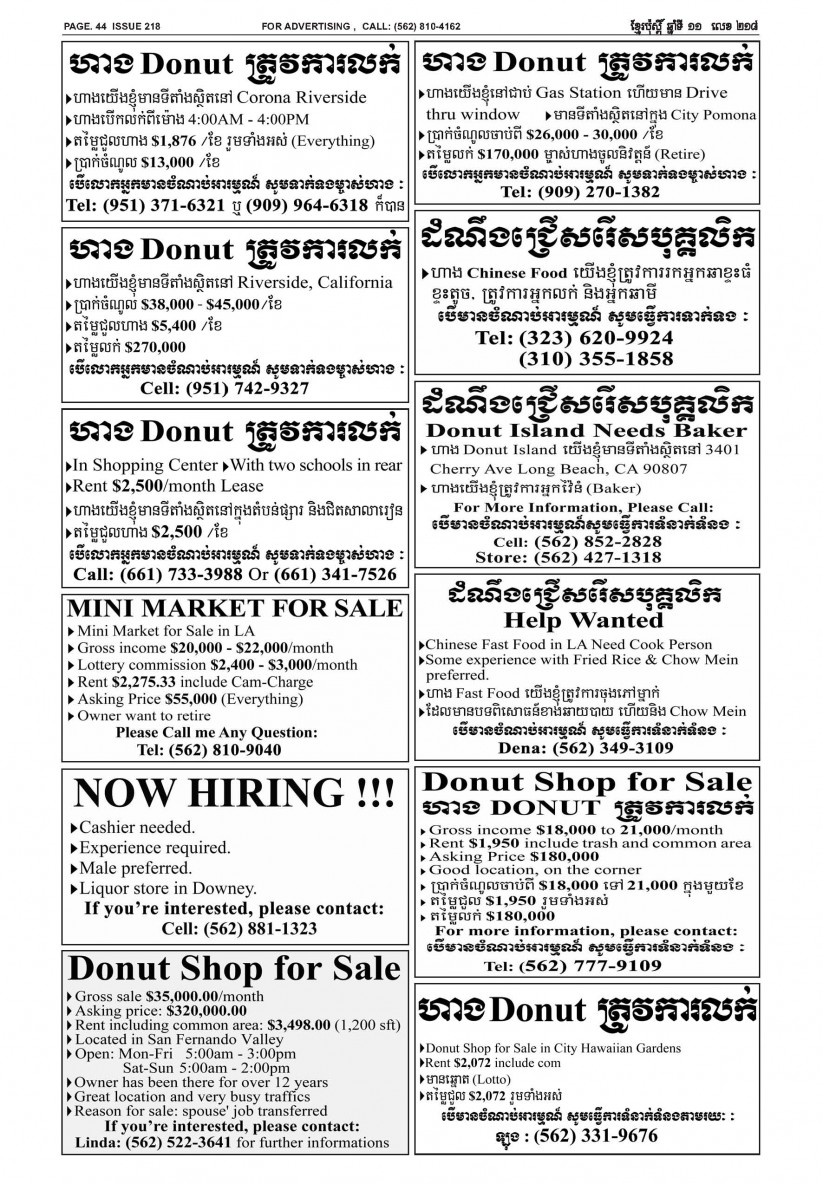 បើមានចំណាប់អារម្មណ៍ សូមធ្វើការទំនាក់ទំនងតាមរយៈ : P.O Box 4073, Long Beach CA 90804, 4Tel: (562) 810-4162 Jamie Meach / (626) 244-1183 Dara Long 4Email: info@thekhmerposts.com or jamiemeach09@gmail.com, 4 Web site: www.thekhmerposts.com