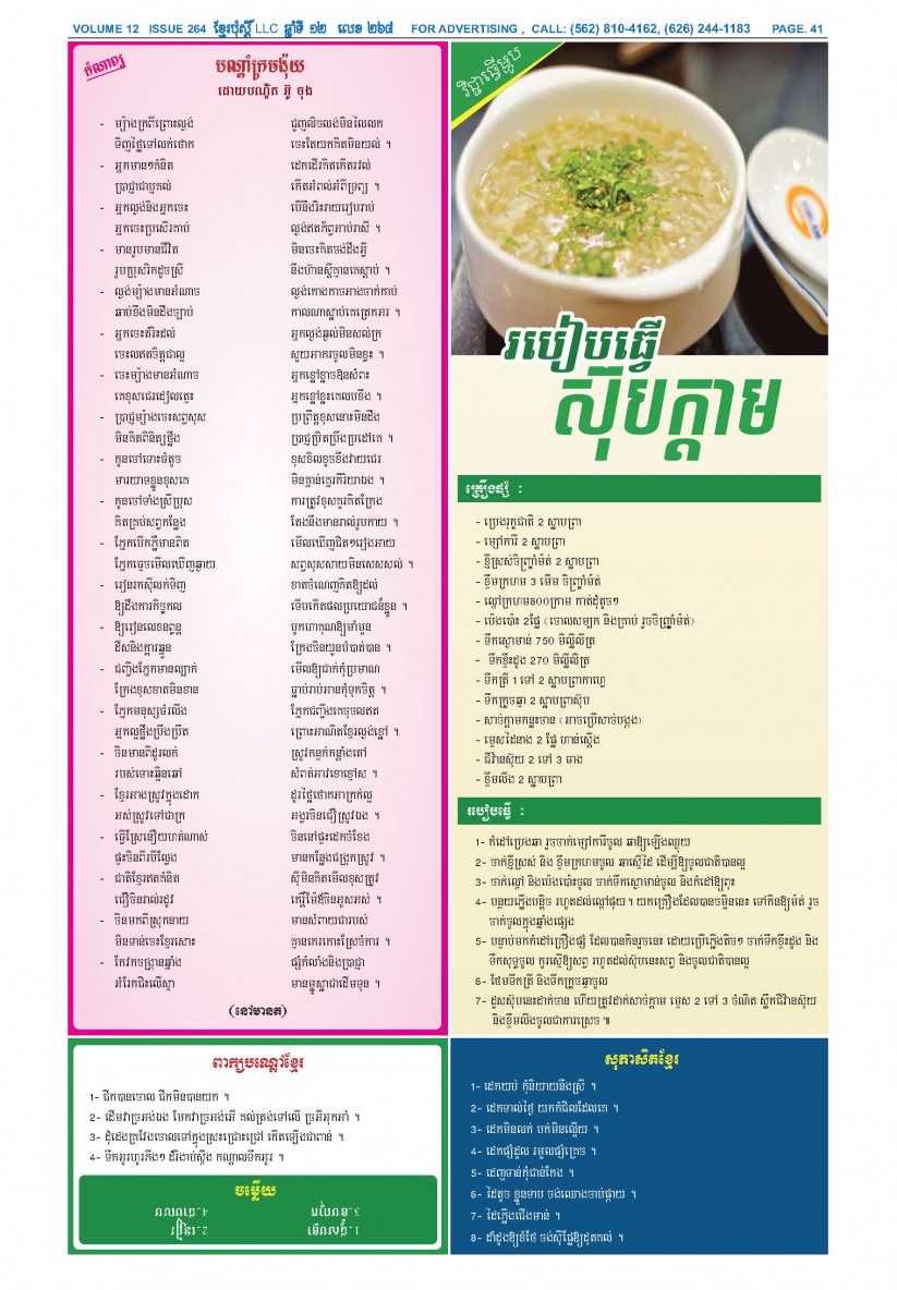 បើមានចំណាប់អារម្មណ៍ សូមធ្វើការទំនាក់ទំនងតាមរយៈ : P.O Box 4073, Long Beach CA 90804, 4Tel: (562) 810-4162 Jamie Meach / (626) 244-1183 Dara Long 4Email: info@thekhmerposts.com or jamiemeach09@gmail.com, 4 Web site: www.thekhmerposts.com