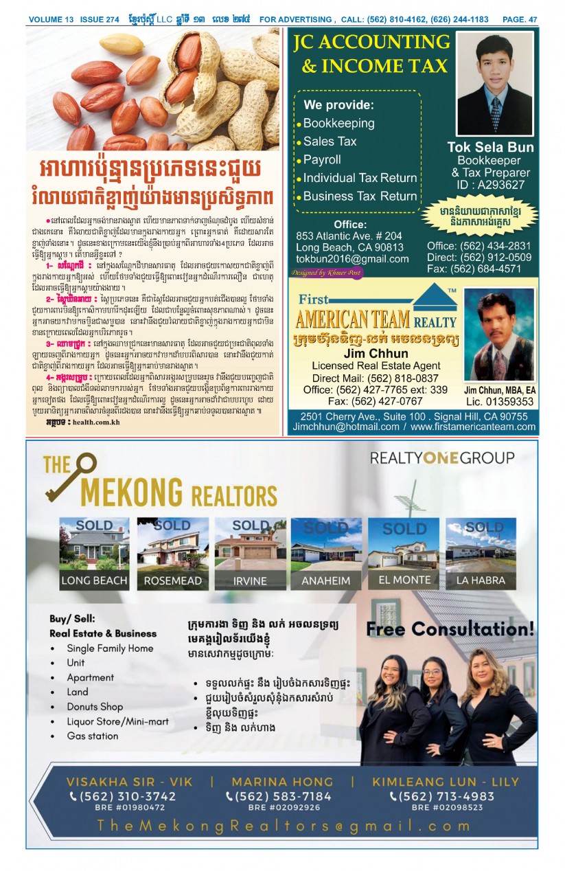 បើមានចំណាប់អារម្មណ៍ សូមធ្វើការទំនាក់ទំនងតាមរយៈ :  P.O Box 4073, Long Beach CA 90804, 4Tel: (562) 810-4162 Jamie Meach / (626) 244-1183 Dara Long 4Email: info@thekhmerposts.com or jamiemeach09@gmail.com, 4 Web site: www.thekhmerposts.com
