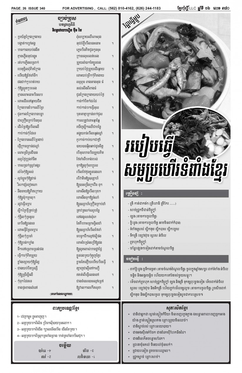 បើមានចំណាប់អារម្មណ៍ សូមធ្វើការទំនាក់ទំនងតាមរយៈ : P.O Box 4073, Long Beach CA 90804, 4Tel: (562) 810-4162 Jamie Meach / (626) 244-1183 Dara Long 4Email: info@thekhmerposts.com or jamiemeach09@gmail.com, 4 Web site: www.thekhmerposts.com