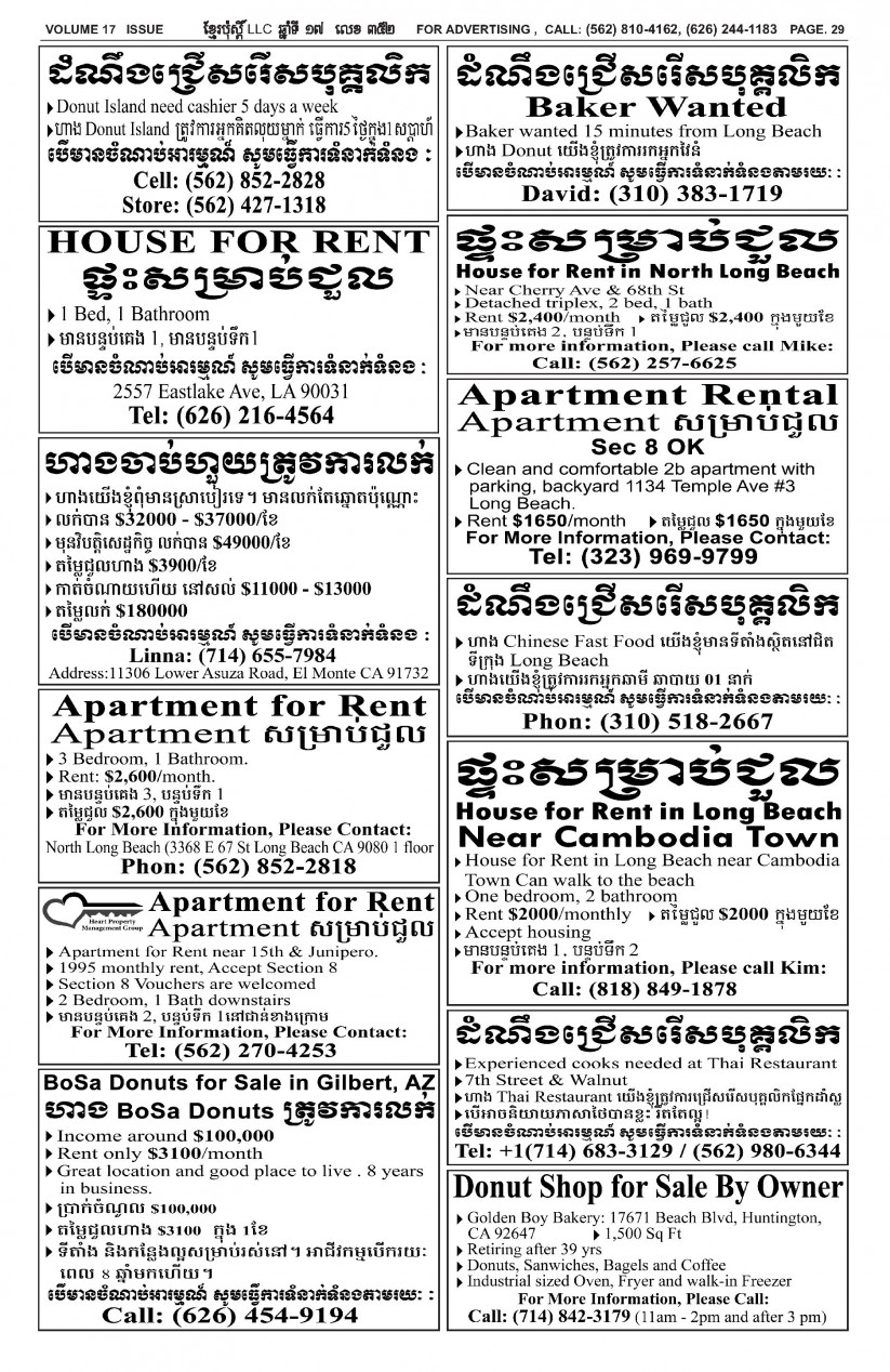 បើមានចំណាប់អារម្មណ៍ សូមធ្វើការទំនាក់ទំនងតាមរយៈ :  P.O Box 4073, Long Beach CA 90804, 4Tel: (562) 810-4162 Jamie Meach / (626) 244-1183 Dara Long 4Email: info@thekhmerposts.com or jamiemeach09@gmail.com, 4 Web site: www.thekhmerposts.com