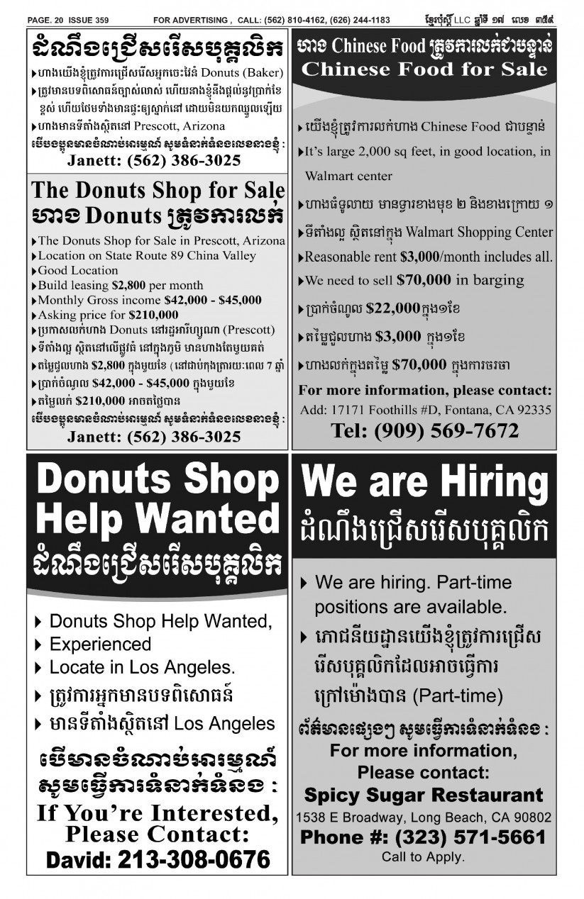បើមានចំណាប់អារម្មណ៍ សូមធ្វើការទំនាក់ទំនងតាមរយៈ : P.O Box 4073, Long Beach CA 90804, 4Tel: (562) 810-4162 Jamie Meach / (626) 244-1183 Dara Long 4Email: info@thekhmerposts.com or jamiemeach09@gmail.com, 4 Web site: www.thekhmerposts.com